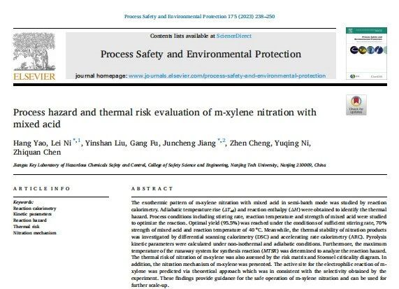 南京工業(yè)大學(xué)倪磊副教授團(tuán)隊(duì)在 Process Safety and Environmental Protection 期刊發(fā)表題為 Process hazard and thermal risk evaluation of m-xylene nitration with mixed acid 論文,該成果由國(guó)家自然科學(xué)基金項(xiàng)目(No.21927815, 51834007, 52274209) 支持。項(xiàng)目研究了間二甲苯混酸硝化工藝的過程危害及熱風(fēng)險(xiǎn)評(píng)估;其中仰儀科技絕熱加速量熱儀被應(yīng)用于對(duì)硝化產(chǎn)物的熱失控測(cè)試及動(dòng)力學(xué)分析,此外也對(duì)混酸硝化工藝的反應(yīng)風(fēng)險(xiǎn)進(jìn)行了評(píng)估。