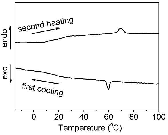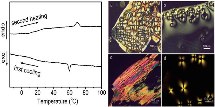 通過(guò)DSC可以十分方便地確定液晶材料的液晶溫度區(qū)間,這對(duì)于液晶材料的應(yīng)用具有十分重要的意義。該作者利用DSC,冷卻樣品之后再加熱,發(fā)現(xiàn)所研究對(duì)象在玻璃態(tài)轉(zhuǎn)化之后進(jìn)入液晶區(qū)間,直到60℃后完全轉(zhuǎn)化為各向同性的液體(文獻(xiàn):Chem. Commun. 2009, 5269-5271.)。