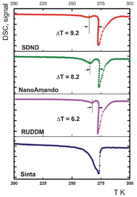2013年Nanoscale上一篇文獻(xiàn)(Nanoscale, 5(4), 1529-1536.)報(bào)道,合成納米鉆石的前驅(qū)體中不僅含有自由的水分子,而且其孔道中還包含有納米水團(tuán),這兩種水在DSC中會(huì)出現(xiàn)不同的熔化峰。研究表明這兩種水的熔點(diǎn)差異(△T)可以用于判斷前驅(qū)體的分散性,作者表明這是其他的常規(guī)表征手段所無(wú)法做到的。