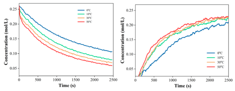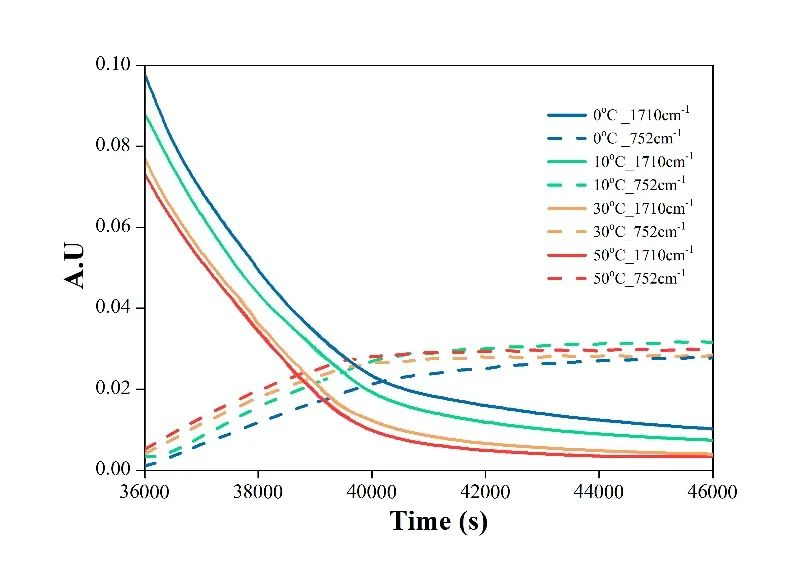 在0℃、10℃、30℃、50℃的等溫條件下進行間歇式反應,反應過程中原位采集體系紅外光譜,獲得1710 cm-1和 753cm-1吸收峰的強度隨時間變化數(shù)據(jù)。結果如下圖所示: