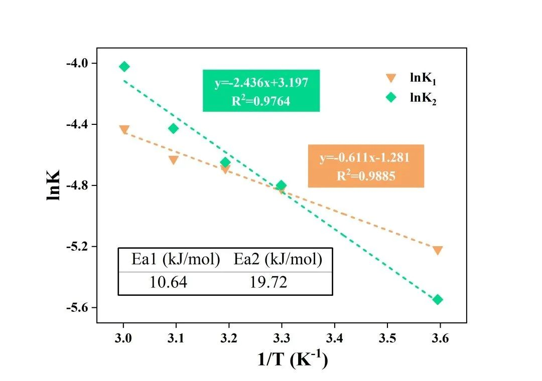 進一步根據(jù)阿倫尼烏斯方程lnk=lnA-Ea/RT對lnk與1/T進行線性擬合,可計算得到表觀活化能Ea1和Ea2,結果如下圖所示: