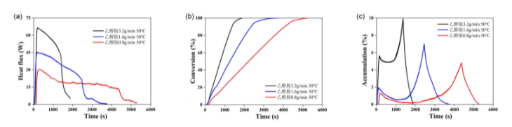 圖8 (a)反應放熱、(b)轉化率和(c)物料積累隨反應時間變化