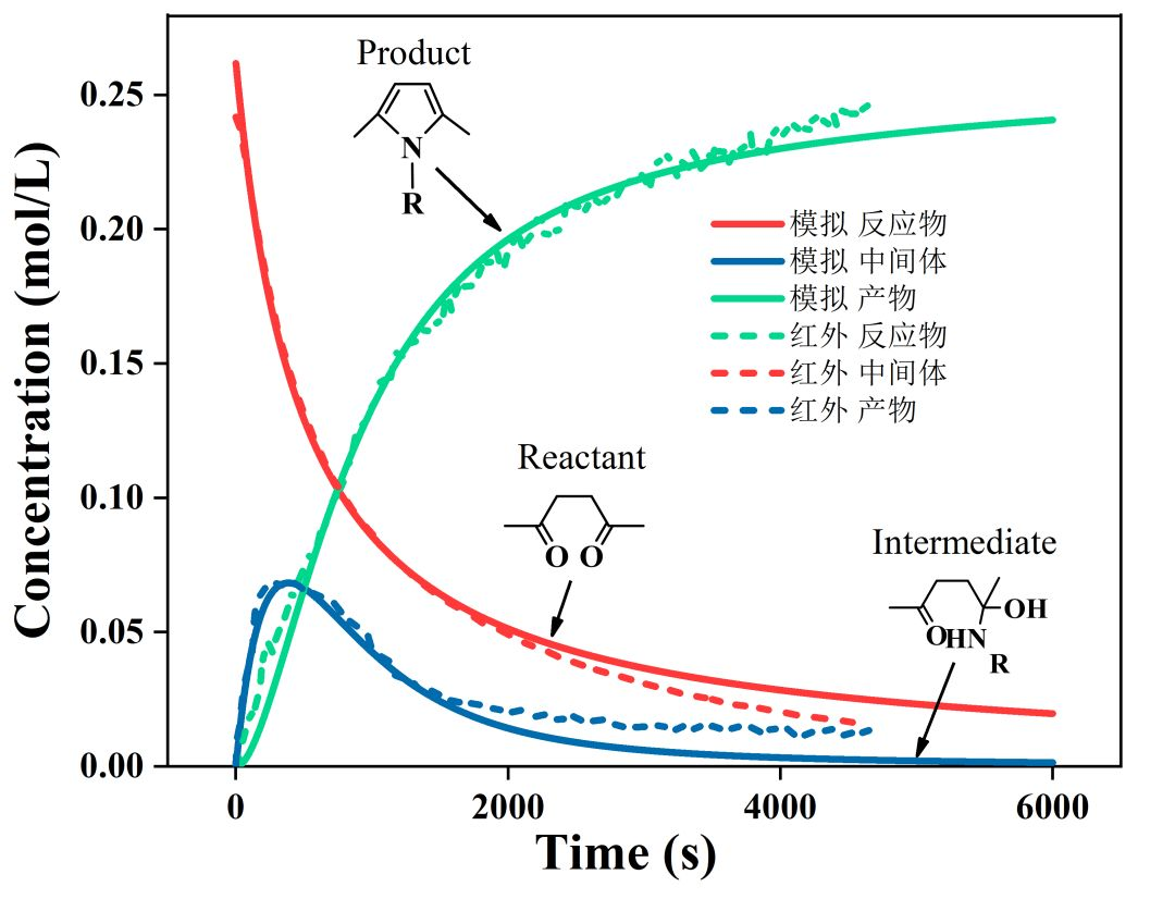 根據(jù)反應動力學模型和計算得到的動力學參數(shù)可預測反應物、中間體和產(chǎn)物的濃度隨時間變化規(guī)律。如圖6所示,通過軟件模擬與紅外定量得到的變化趨勢基本吻合,說明該動力學模型可以較好地描述反應過程。