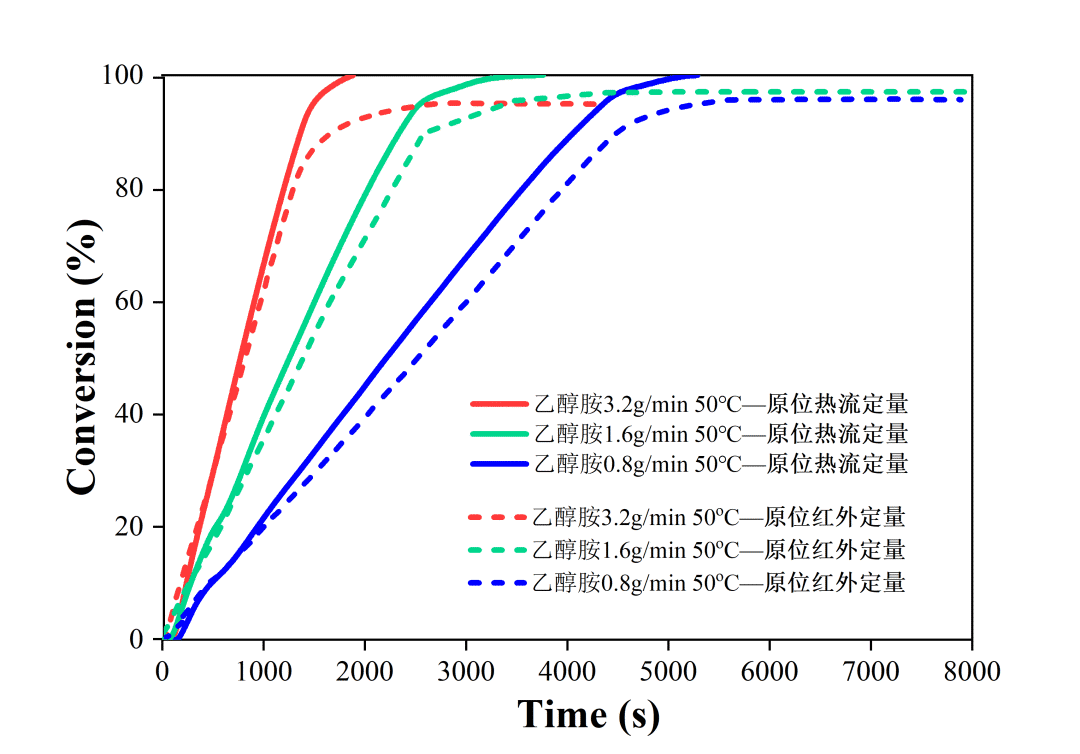 我們將通過紅外與在線量熱分別計算得到的轉化率曲線進行對比,可以發(fā)現(xiàn)兩者非常接近??梢哉J為前者代表了反應物轉化率變化,后者代表了反應完成度變化,均可以體現(xiàn)反應的動力學特征。理論上,化學反應轉化率越高,兩者的差異越小。