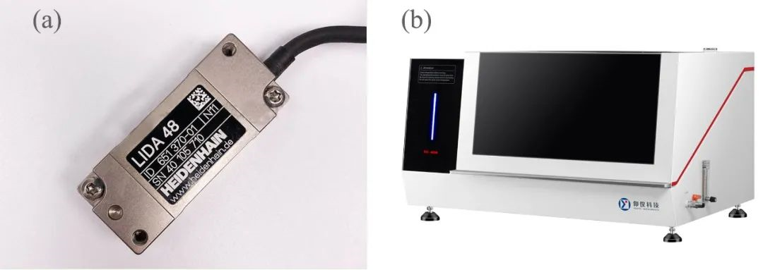 圖1 (a)光柵尺讀數(shù)頭及(b) BIC-400A等溫量熱儀示意圖