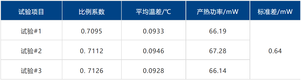 測(cè)量結(jié)果如圖3與表1所示,該讀數(shù)頭的產(chǎn)熱功率約為67mW,3次測(cè)試重復(fù)性?xún)?yōu)于1%。另外,綠色陰影區(qū)域?yàn)榱繜醿x實(shí)測(cè)得到的產(chǎn)熱功率變化,藍(lán)色區(qū)域?yàn)橥茰y(cè)的讀數(shù)頭真實(shí)產(chǎn)熱功率。由于樣品自身的熱容以及讀數(shù)頭至冷板的導(dǎo)熱路徑上存在熱阻,實(shí)測(cè)數(shù)據(jù)存在一定的熱滯后現(xiàn)象。根據(jù)被測(cè)系統(tǒng)的傳熱特性,可以利用一階校準(zhǔn)公式對(duì)熱滯后進(jìn)行修正。
