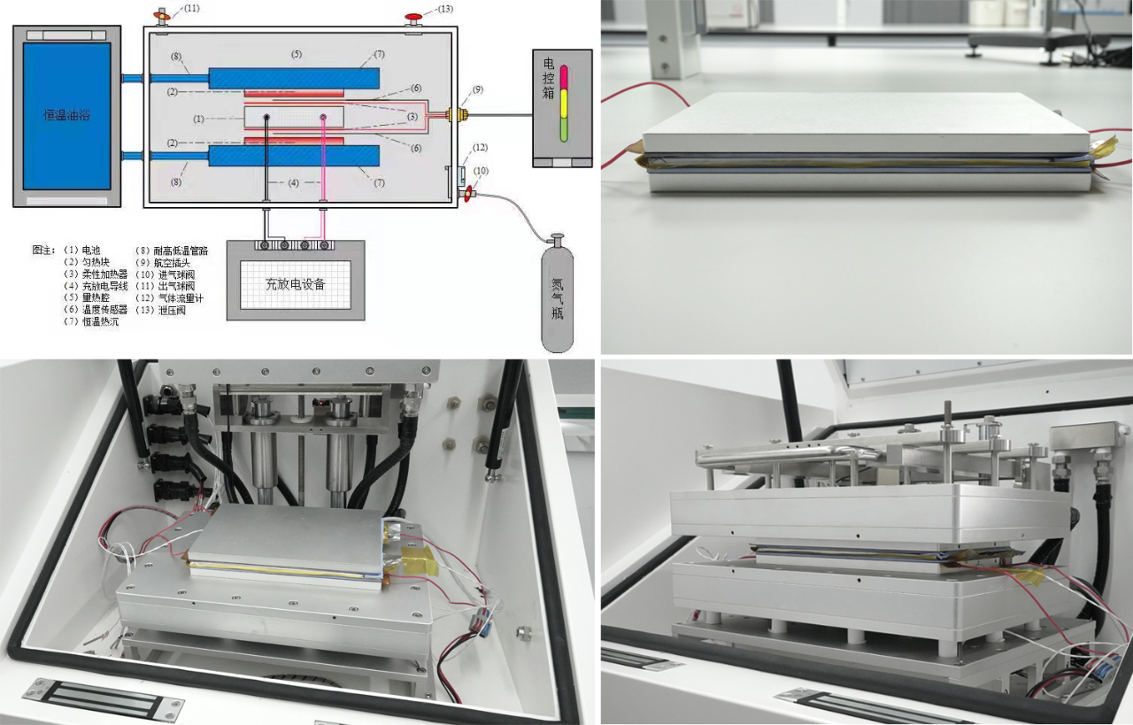 Step1:打開(kāi)等溫量熱儀蓋板,至下向上依次安裝勻熱塊-加熱片-導(dǎo)熱硅脂墊-電池樣品-導(dǎo)熱硅脂墊-加熱片-勻熱塊,如圖2,保證各部件之間不產(chǎn)生間隙;