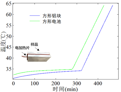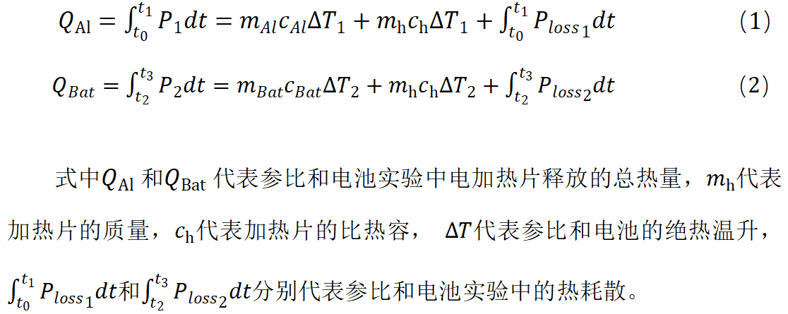 比熱容測試基于差示絕熱追蹤的原理。簡而言之,在量熱儀的絕熱追蹤工作模式下,利用柔性電加熱片對鋰電池與已知比熱容的標(biāo)準(zhǔn)樣品(通常為鋁質(zhì))進(jìn)行加熱,并盡量控制樣品與參比的升溫歷程一致。根據(jù)式(1)和式(2),利用參比可計算和扣除由于測試過程中實驗環(huán)境難以達(dá)到完全理想絕熱而耗散至環(huán)境中的熱量,從而精確測量鋰電池比熱容。