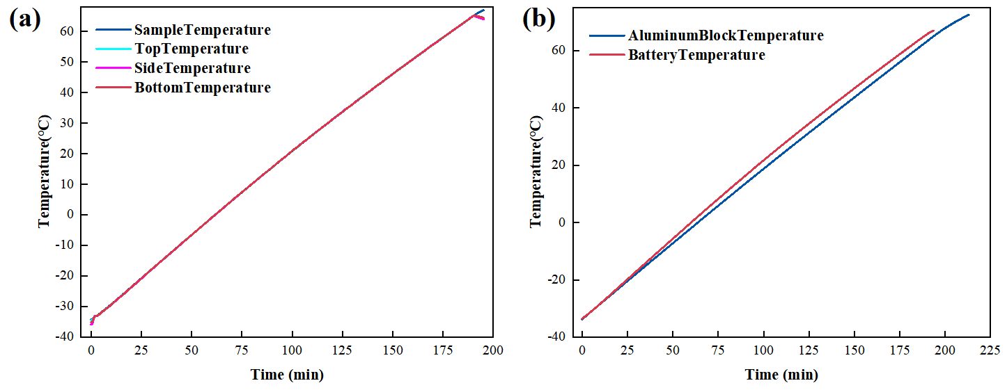如圖3(a)所示,實驗過程中量熱腔爐體溫度與樣品溫度始終保持緊密貼合,溫差低于±0.2℃。準(zhǔn)絕熱測試環(huán)境封閉了樣品的熱耗散,能夠顯著降低難以準(zhǔn)確測量的不確定項所引入的系統(tǒng)誤差。圖3(b)為電池及參比在比熱容實驗中的溫升曲線,由于兩者熱容存在差異性,因此相同加熱功率下溫升速率不完全一致。圖3(c)顯示了測定得到的電池變溫比熱容曲線(每5℃平均),可以發(fā)現(xiàn)隨著溫度上升,比熱容呈單調(diào)上升趨勢。同時可計算得到電池在-30℃到65℃范圍內(nèi)的平均比熱容為1024.64kJ/(kg*℃)。