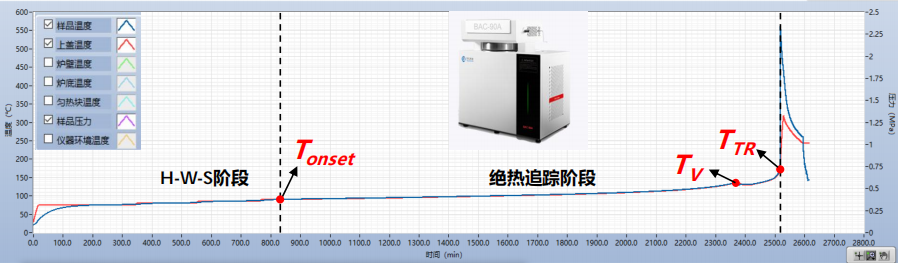 以18650電池為例,可利用小型電池絕熱量熱儀進行測試。利用儀器的H-W-S工作模式進行熱失控實驗,可以得到如圖3所示的電池熱失控溫升曲線。曲線前半部分為“H-W-S” 模式,儀器將通過外部加熱實現(xiàn)電池臺階式升溫,并重復進行加熱-等待-搜尋過程,直至檢測到鋰電池開始自放熱。隨后儀器將自動跳轉(zhuǎn)為“絕熱追蹤”模式,電加熱系統(tǒng)將控制電池周圍的環(huán)境溫度緊跟電池溫度變化,確保電池產(chǎn)熱完全用于升高自身溫度。通過鋰電池熱失控曲線,我們可以對其中一些特殊的溫度點進行測定和分析,評估電池的熱安全性能。例如,Tonset是鋰電池自放熱起始溫度,電池自產(chǎn)熱速率高于0.02 ℃/min,可以認為該溫度下SEI膜開始分解。高于此溫度,電池將出現(xiàn)明顯的自產(chǎn)熱;而TTR是熱失控引發(fā)溫度,一般定義為電池的自產(chǎn)熱速率高于1℃/s 的溫度。在此溫度后,電池將出現(xiàn)劇烈溫升,溫升速率可能高達105 ℃/min,同時一般會伴隨產(chǎn)生大量的光和熱;Tmax是鋰電池熱失控過程能達到的最高溫度。