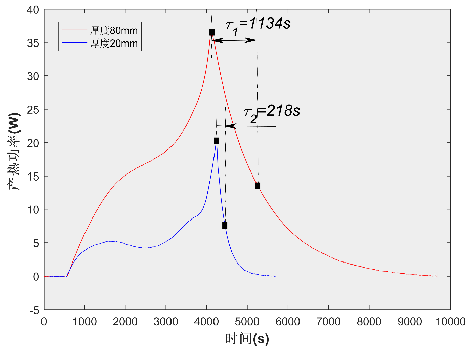 由于厚度不同的電池在容量上難以一致,因此本文選用兩款容量不同、大面面積相似、而厚度分別為20mm和80mm的磷酸鐵鋰電池(#1和#2),進行1C恒流放電實驗。理論上放電過程中電池內(nèi)阻隨SOC下降而單調(diào)遞增,所以放電結(jié)束時刻電池產(chǎn)熱功率應(yīng)達到最大值。但等溫量熱儀測量存在的熱滯后效應(yīng)導(dǎo)致放電結(jié)束后熱功率曲線需要經(jīng)過一定時間才能衰減為零。此處定義放電結(jié)束后功率從峰值衰減至峰值1/e的時間τ為熱滯后時間常數(shù)。τ的大小與電池至加熱片之間非穩(wěn)態(tài)傳熱的時間常數(shù)相關(guān)。如圖2所示,對于厚度為80mm的#2電池,τ?=1134,明顯大于#1電池的計算結(jié)果(τ?=218),說明電池厚度增加會顯著影響電池產(chǎn)熱測量的動態(tài)響應(yīng),這可能是由于電池?zé)崛莺蛢?nèi)部熱阻都與厚度正相關(guān)。