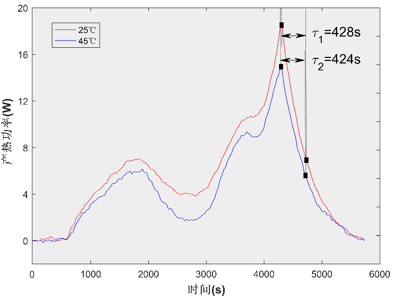 不同工作溫度下電池產(chǎn)熱特性存在差異。如圖4,在45℃條件下#3電池產(chǎn)熱功率略小于25℃下的結(jié)果,但兩者的熱滯后時間常數(shù)基本一致。可以初步認為溫度與熱滯后沒有明顯關(guān)聯(lián)性,這可能是由于溫度小幅度變化對系統(tǒng)傳熱特性幾乎沒有影響。