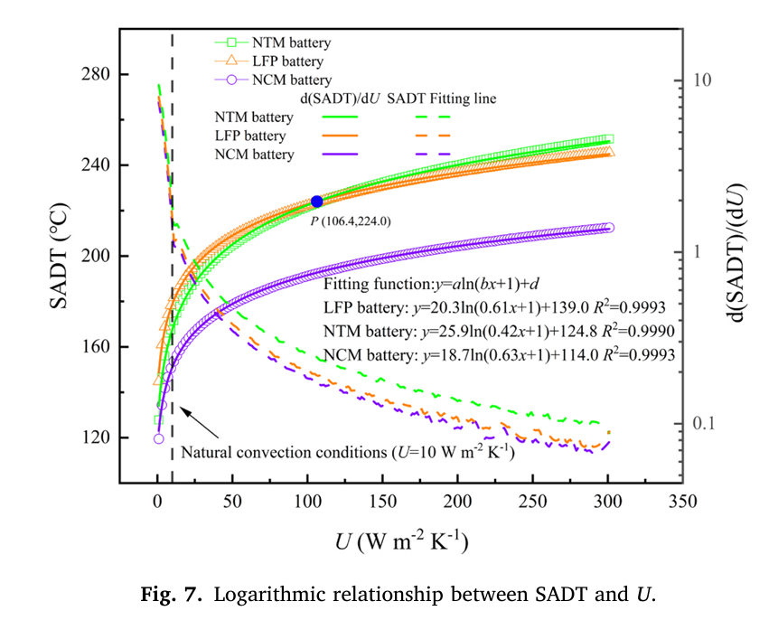 在電池儲(chǔ)存和運(yùn)輸場景中,當(dāng)環(huán)境溫度(T0)升高到一定程度,系統(tǒng)放熱速率大于散熱速率,導(dǎo)致電池溫度持續(xù)上升,直至觸發(fā)電池?zé)崾Э?。此臨界溫度 (T0) 即為 SADT。本研究基于BAC-90A測試的熱特性參數(shù),結(jié)合熱平衡方程和謝苗諾夫模型。計(jì)算出了三種電池的自加速分解溫度(SADT)與系統(tǒng)表面?zhèn)鳠嵯禂?shù)(U)的對(duì)數(shù)關(guān)系。為評(píng)估電池在不同散熱條件下的熱失控臨界性提供量化依據(jù)。