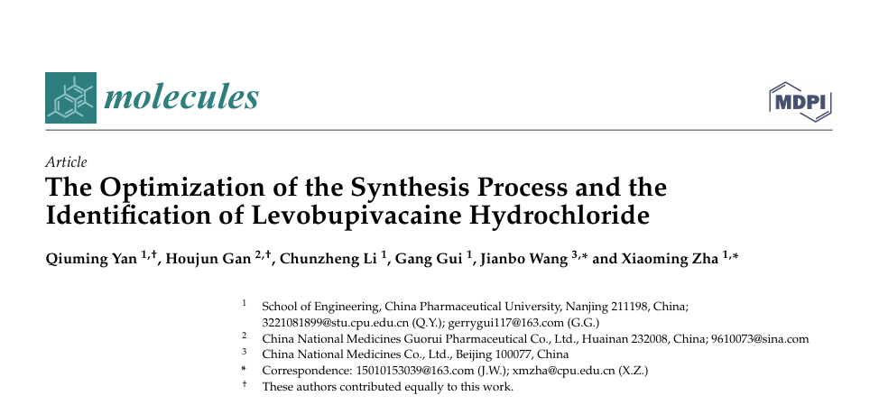 中國(guó)藥科大學(xué)工學(xué)院查曉明教授團(tuán)隊(duì)在Journal | [J] Molecules(IF:4.2)發(fā)表題為The Optimization of the Synthesis Process and the Identification of Levobupivacaine Hydrochloride論文,該成果由中國(guó)藥科大學(xué)工學(xué)院、國(guó)藥集團(tuán)國(guó)瑞藥業(yè)有限公司及中國(guó)民族醫(yī)藥股份有限公司等機(jī)構(gòu)聯(lián)合支持。