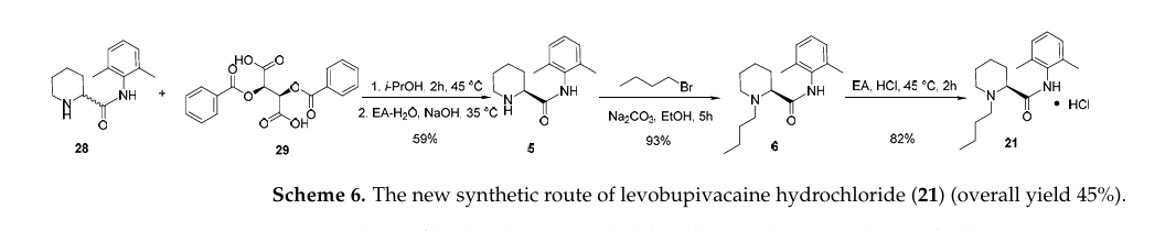 本研究從起始原料的可用性和成本效益、操作簡(jiǎn)便性、綠色環(huán)保、設(shè)備可及性、工業(yè)化可行性、優(yōu)化的手性合成和安全性等維度考慮,優(yōu)化和改進(jìn)了一種更可行的鹽酸左布比卡因(21)合成工藝(Scheme 6),這種新方法能克服現(xiàn)有方法的復(fù)雜性和高成本,有利于促進(jìn)大規(guī)模工業(yè)化生產(chǎn)。